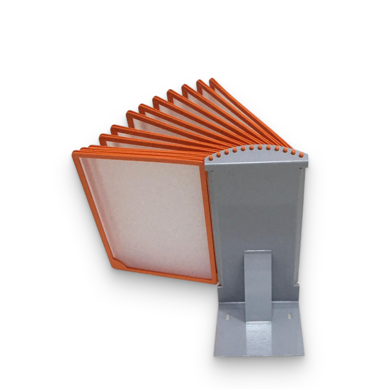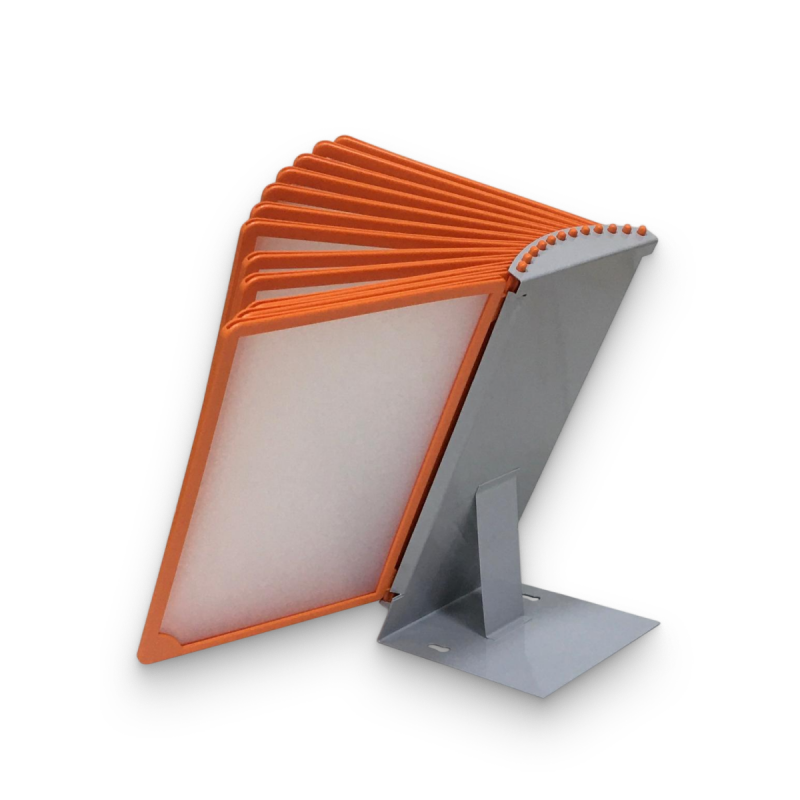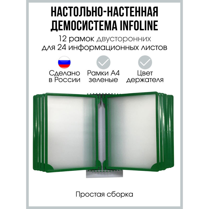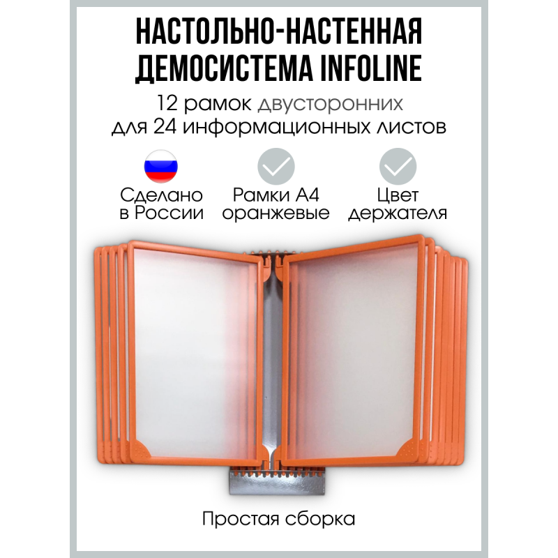 Арт. 39194-grey-12 Перекидная демосистема настольно-настенная. Эта модель популярна как настольный и настенный вариант информационной системы. Угол наклона металлического кронштейна для рам 75 градусов очень удобен для чтения информации. Перекидная система может быть укомплектована максимальным количеством из 12 рам и 12 протекторов. Цвет рам: белый, чёрный, красный, синий, оранжевый, зелёный, жёлтый, светло-серый, шоколадный коричневый.